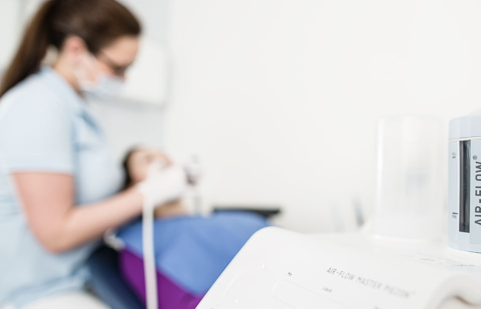 Entfernung extrem hartnäckiger Beläge (z. B. durch Zigaretten und Rotwein) mit Pulverstrahl (Air-Flow®)